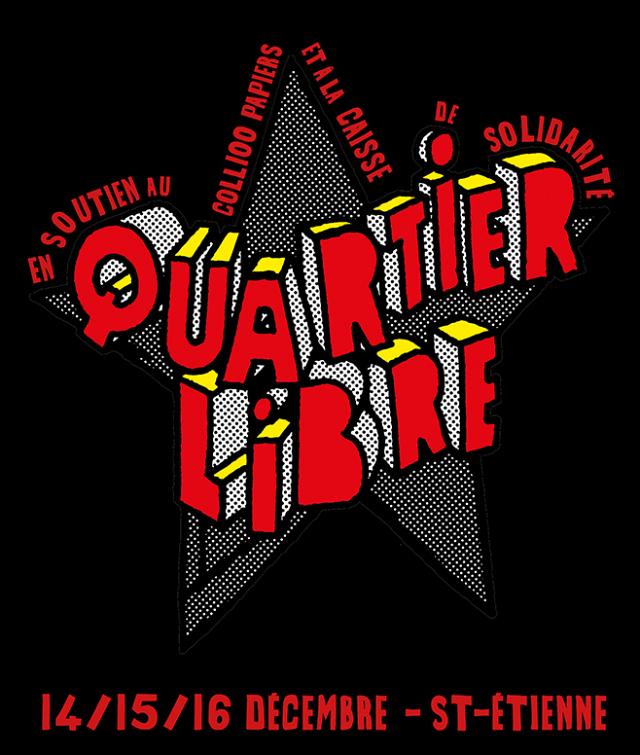 Pour la troisième année consécutive les structures stéphanoises Les Arts du Forez, Avataria, J’aime la Danse, La France Pue, Coll100 papiers, Les Créations du Crâne, La Dérive, La Gueule Noire, Ursa Minor et Radio Dio se regroupent pour proposer le festival QUARTIERS LIBRES du 14 au 16 décembre dans divers lieux actifs de Saint-Etienne. L’événement se veut festif mais s’articule aussi autours de rencontres, discussions et ateliers. Le rassemblement de nos forces et votre présence qu’on espère massive servira cette année à soutenir le Collectif 100 papiers et la création d’une caisse de solidarité à Saint-Étienne.