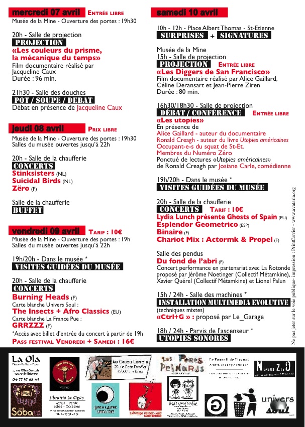 et non exclusive... Des musiques répétitives, industrielles au hip hop en rebondissant sur le rock, punk rock... Le tout au milieu de projections, moments festifs, débats, tables rondes, ...
