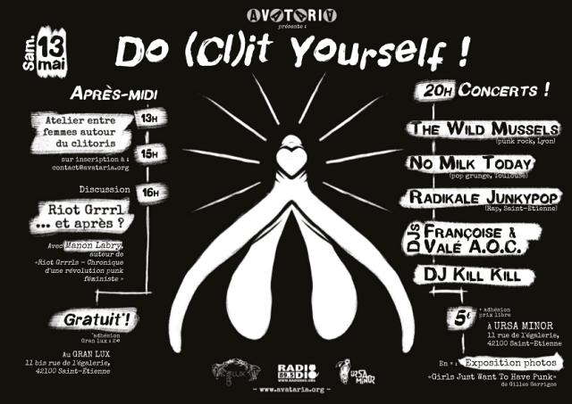 La réappropriation du corps étant au cœur du mouvement politique et musical des Riot Grrrls et étant aussi une préoccupation que nous avions également, nous avons choisi de proposer un atelier sur cette thématique, pour les femmes, ou toute personne équipée d’une vulve. L’idée est de mieux connaître son corps, son anatomie, en faisant un focus sur le clitoris, organe de plaisir féminin, souvent complètement délaissé, dans les discours et représentations, des champs éducatif et médical.