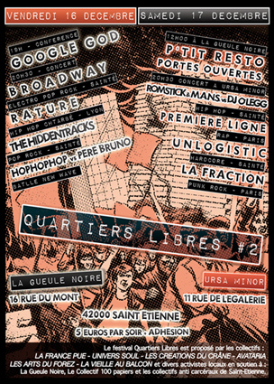 Devant l’aseptisation généralisée du monde culturel et face à la Crise économique, l’apocalypse imminente et les élections présidentielles, nous avons décidé de reconduire le Festival Quartiers Libres pour une nouvelle année. Acteurs/trices de la scène alternative ou indépendante stéphanoise, nous unissons nos forces pour créer cet événement dont le but initial reste inchangé : soutenir des collectifs locaux dont les combats nous sont proches et qui nous semblent vitaux.